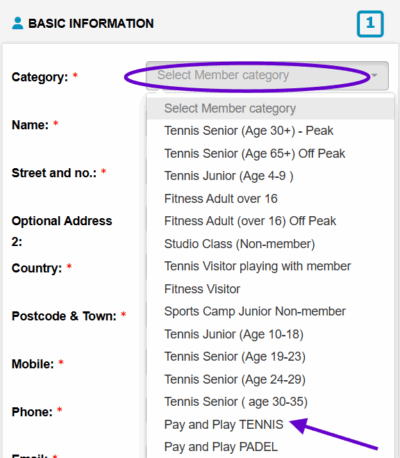 When completing the registration form, you will see a category at the top of the basic information page. Please go to the drop down list and select Pay and Play Tennis.